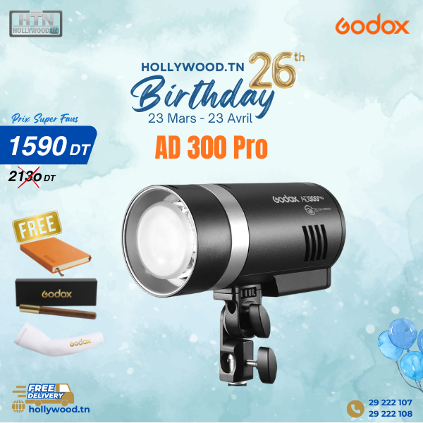 Le Godox AD300Pro est un flash monolight nomade de 300 Ws qui conjugue hautes performances et grande mobilité. Il offre une stabilité colorimétrique d’environ ±100 K et intègre un récepteur radio Godox X pour une utilisation immédiate en configuration multi-flash.