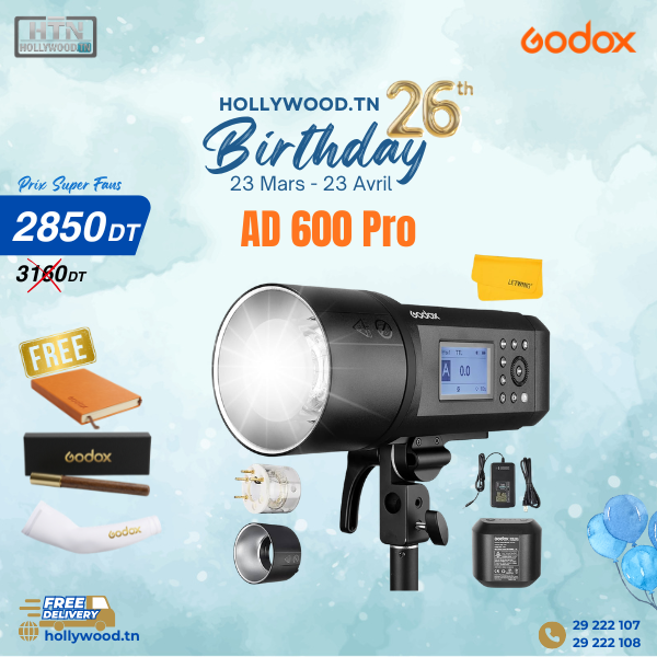 Le GODOX AD600 Pro est un flash monobloc compact et puissant, délivrant 600 Ws pour répondre aux besoins des photographes et vidéastes professionnels. Avec sa monture Bowens, il s’intègre facilement aux accessoires existants, tandis que son design robuste garantit une utilisation fluide en studio comme en extérieur.