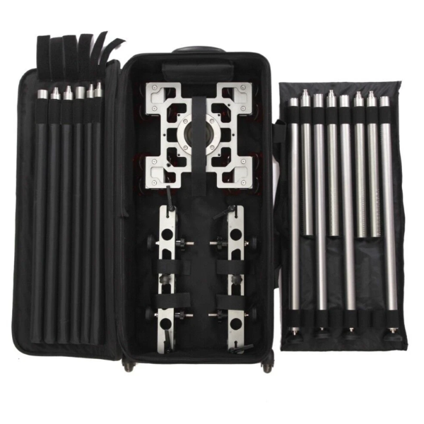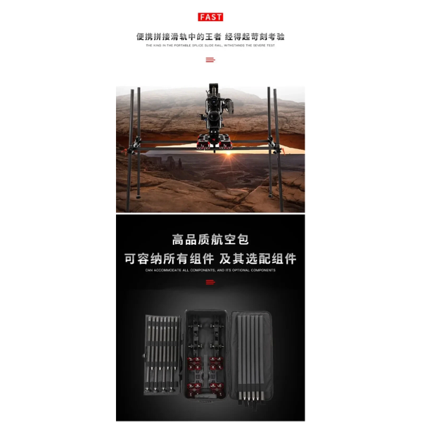 L’ensemble du kit est conçu pour le transport avec un poids net de 16 kg et un emballage compact de 220 x 450 x 990 mm pour un poids total emballé de 23,3 kg. La robustesse de la construction aluminium assure une longévité optimale dans les conditions d’utilisation intensive des plateaux professionnels. Ce slider est compatible avec les caméras cinéma, les caméscopes broadcast et les setups DSLR/mirrorless les plus exigeants.