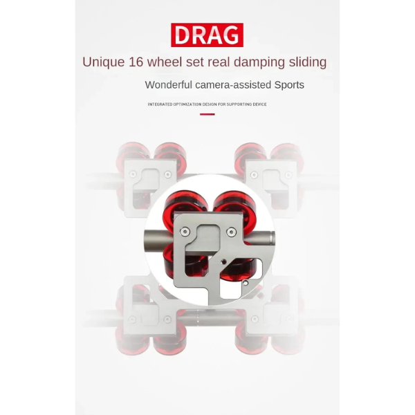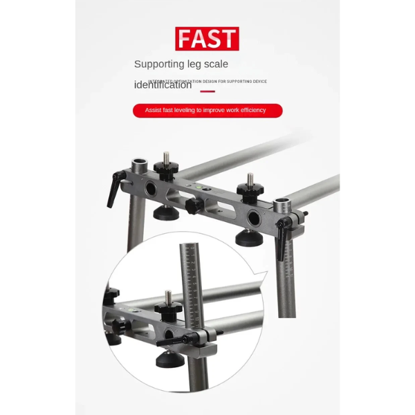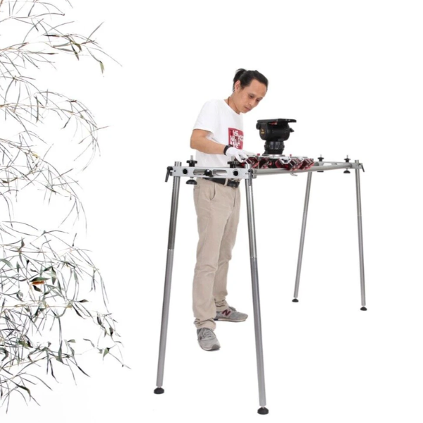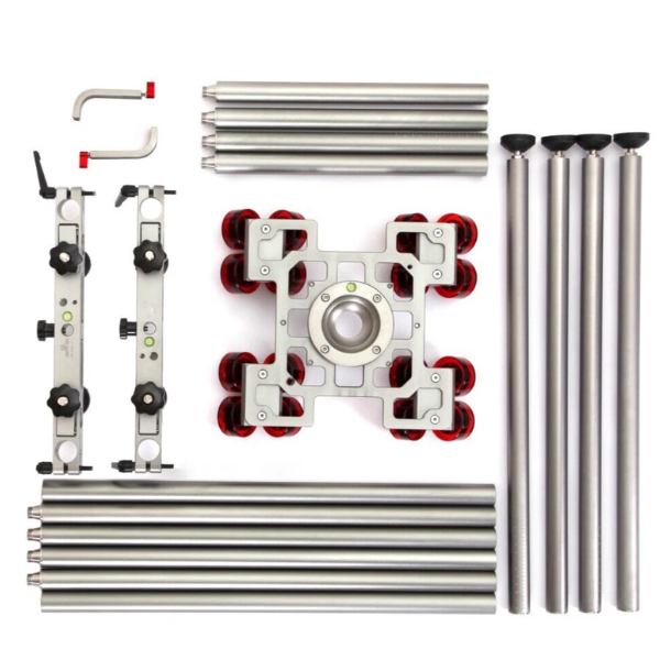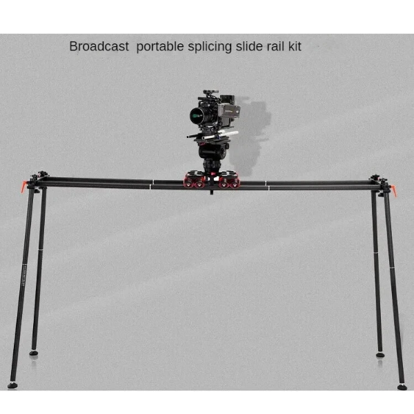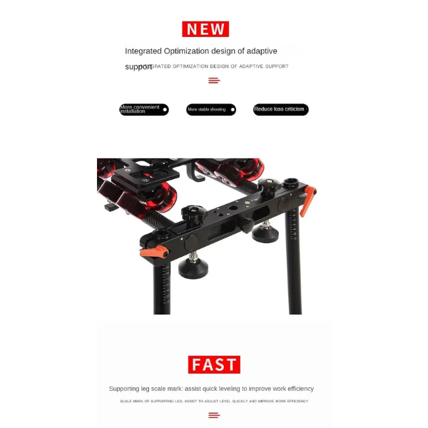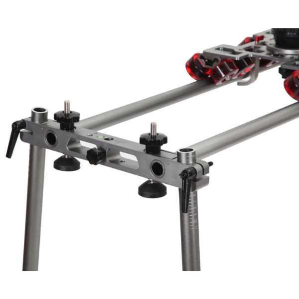 Le système de pieds est composé de deux niveaux de jambes en alliage d’aluminium, avec des jambes de premier ordre de 70 cm et des jambes de second ordre de 40 cm, offrant une hauteur de travail stable et réglable selon les besoins du tournage. La conception modulaire permet un montage et un démontage rapides sur set, avec des pieds à embouts réglables pour compenser les surfaces irrégulières. Le slider peut être utilisé aussi bien au sol que sur trépieds ou light stands pour des prises de vue en hauteur.